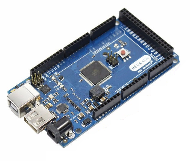 El MEGA Arduino ADK es una placa electronica basada en el Atmega2560 (ficha técnica). Cuenta con una interfaz de host USB para conectar con los teléfonos basados en Android, basado en el MAX3421E IC. Cuenta con 54 pines digitales de entrada / salida (de los cuales 15 se pueden utilizar como salidas PWM), 16 entradas analógicas, 4 UARTs (puertas seriales), un oscilador de 16MHz, una conexión USB, un conector de alimentación, una cabecera ICSP, y un botón de reinicio. |